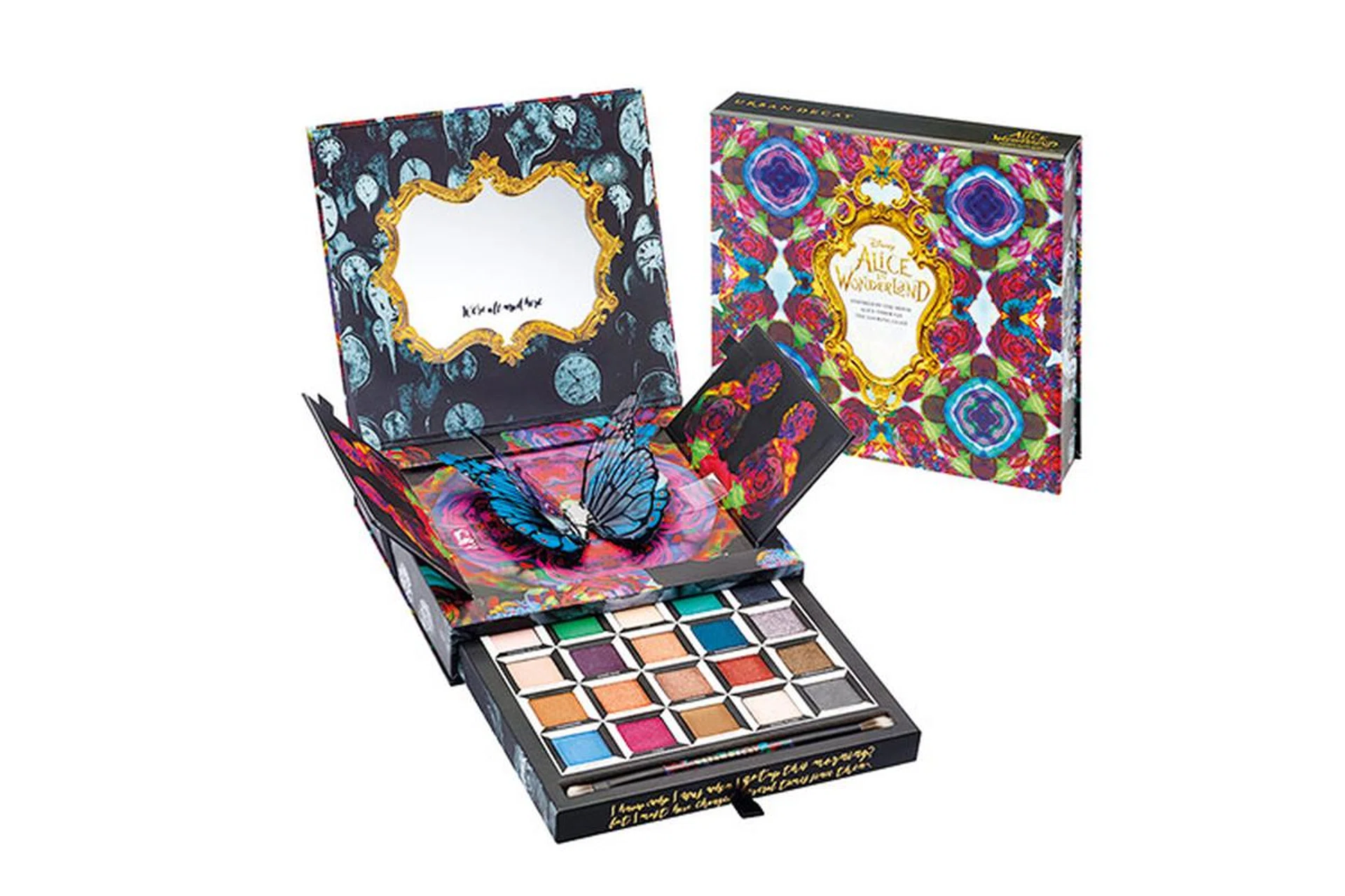 Featuring 20 brand new eyeshadows, every row embodies a character in the film, from Alice (nude and beige) to the Mad Hatter (sparkly green and red) and Time (dark blue and grey). The limited edition palette comes in kaleidoscopic packaging, and the eyeshadows are housed in a drawer that you pull open below a 3D pop-up of a butterfly - yes, the same one you see in the film. Also included: A double-ended brush for easy application.
