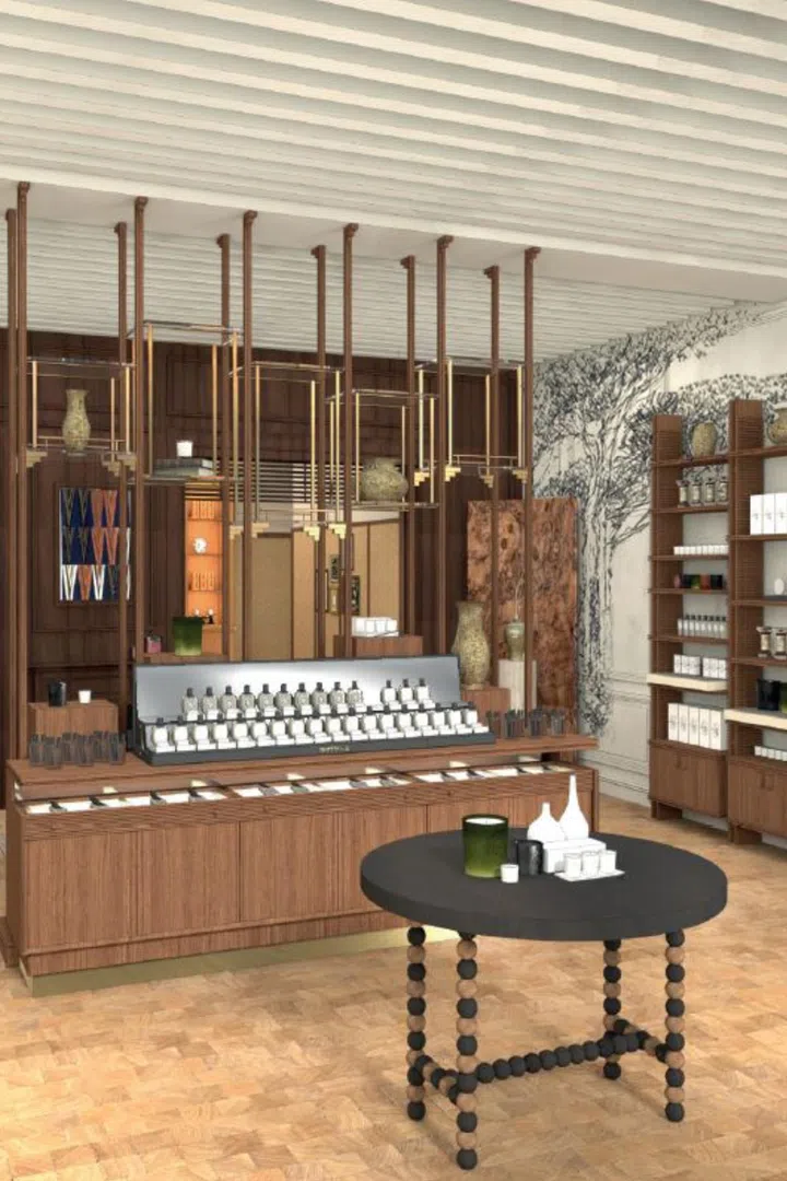 The second outpost of French fragrance brand Diptyque will make you feel at home, literally. Designed as a home away from the Parisian brand’s home, the store is a harmonious blend of cultural influences. A central fireplace and mouldings typical of French apartments are juxtaposed with “colonial-style” touches such as a wood-and-glass furniture unit, rattan panelling and wooden openwork ceiling. Some furniture pieces designed by Singapore-based Studio Kallang make an appearance too. Styled to resemble a vast apartment, the space is sectioned into rooms for customers to meander through and discover the various Diptyque ranges. At the entrance, a wooden console displays the brand’s popular collection of perfumes in signature oval bottles. One of the coloured wall niches holds the Art du Soin collection for the body, available in a palette of textures that range from oils and solids to foams and balms. The space gets cosier as you venture in, furnished with rugs and vases, a boucle-upholstered sofa, and bookcases of scented candles. Fans can also find the brand’s wide range of home scents and decorative accessories that include candlesticks, diffusers, paperweights and lanterns for enhancing candle flames.