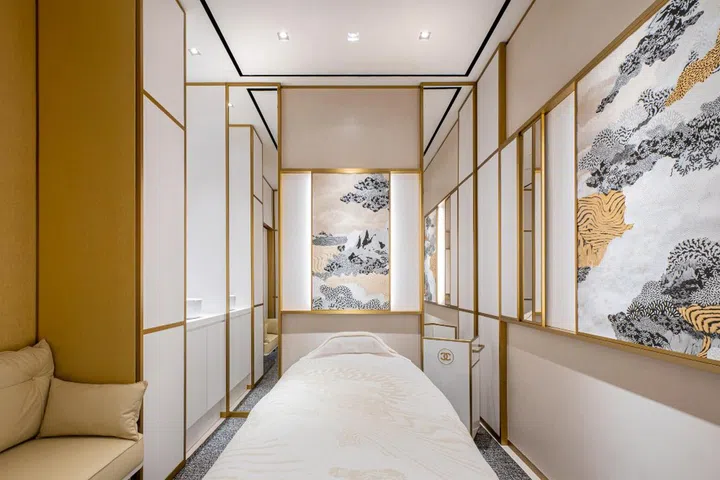 The three luxurious cabin rooms of Chanel Prive, where skin treatments are conducted, are dressed up in wallpaper inspired by the coromandel screens in Gabrielle Chanel's rue Cambon apartment.