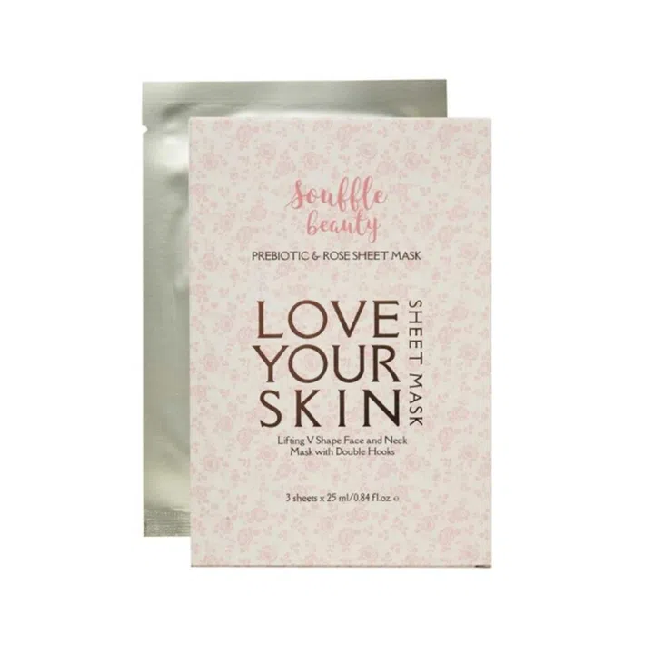 Souffle Beauty prebiotic & rose sheet mask with double hooks, $25 (box of three sheets)