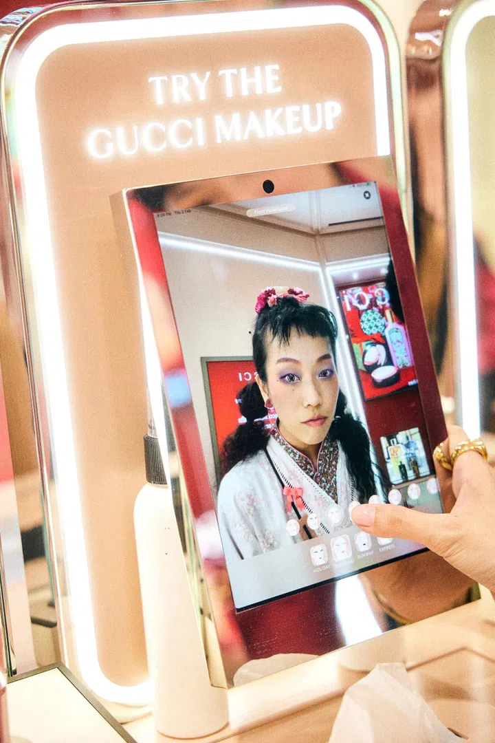 Meanwhile, the key features in-store can be said to be nothing short of state-of-the-art. Take the Virtual Try-On screens, which offer filters of the diverse and dramatic beauty looks created by Gucci Global Makeup Artist Thomas de Kluyver for the brand's runway shows. (Needless to say, our guests had plenty of fun with them – see below for proof.) Or the Immersive Wall through which visitors can discover more about Gucci's cult fragrances simply by placing a bottle of choice on the touch screen pad in front of it.