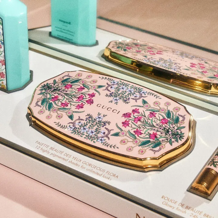 Among the star products of the night were the turquoise-bottled Gucci Flora Gorgeous Jasmine and the limited-edition Palette Beaute Des Yeux Gorgeous Flora (bottom).
