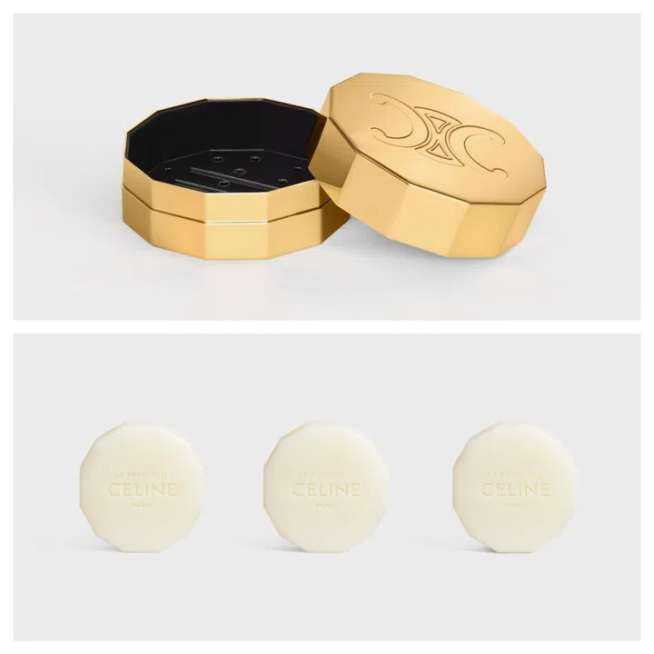 Celine is on a roll with its lifestyle offerings - hot on the heels of its recent perfumed papers launch comes a range of scented bar soaps, the first launch from Celine's upcoming bath and body collection. The Triomphe-embossed soaps comes in four of the maison's emblematic fragrances: Parade, La Peau Nue, Eau de Californie and Reptile and are sold in a customisable coffret set of three ($165 per set). They're said to possess intense aromatic properties, so much so that you can use them akin to diffusers and simply leave them in a small space (such as a wardrobe) to leave a delicate aromatic trail.