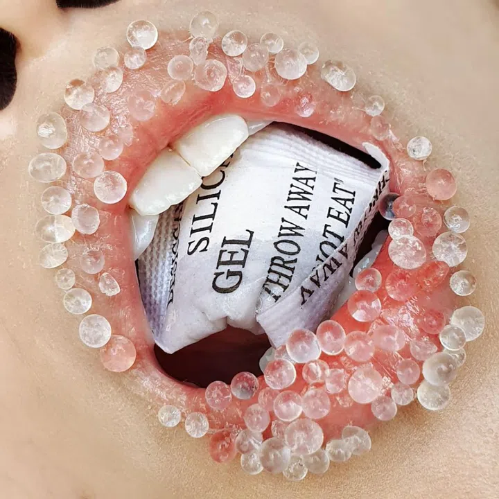 "I really wanted to play with the irony of having ‘Do Not Eat’ in my mouth. When I was a kid, desiccant packets were this mystical dangerous thing (yet) the beads looked so edible and pretty."