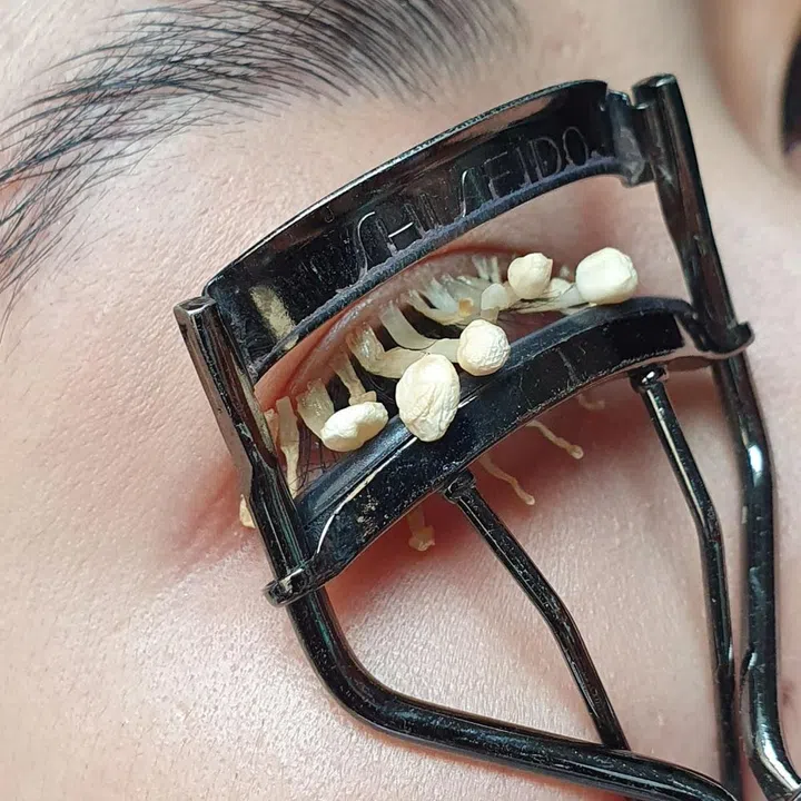 "Enoki has a hair-like quality to it, especially compared with other mushrooms. I did try to turn them into eyebrows, but they worked better as lashes. I actually posted a process video of me curling and gluing each individual mushroom to my eye. It took so long that the mushroom caps started to shrivel slightly, as you can see in the picture."