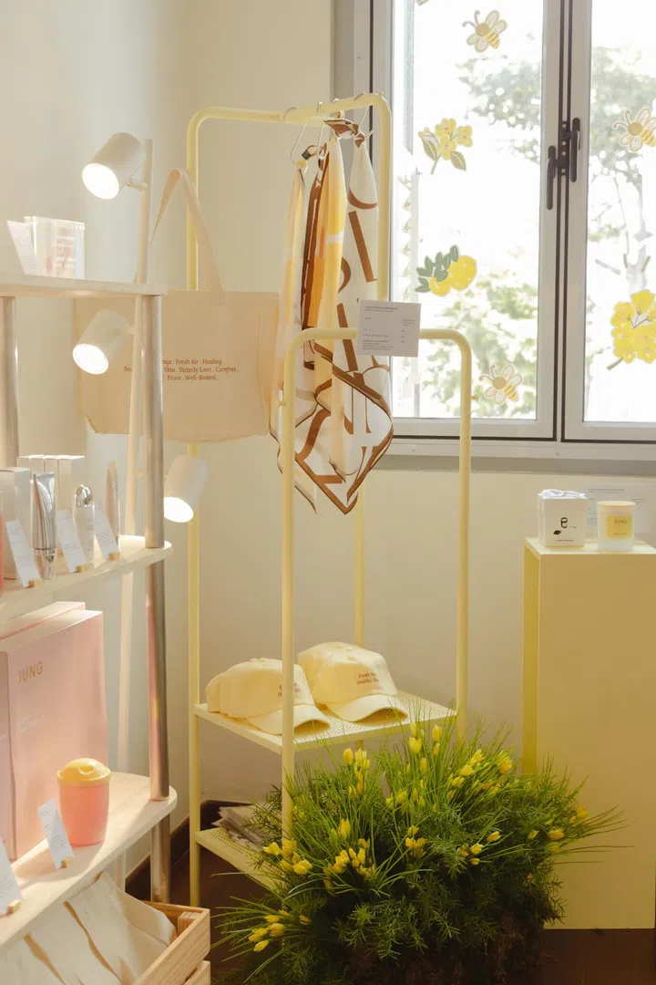 The limited-edition merchandise you'd find at the pop-up includes caps and scarves in a soothing pastel yellow – a nod to the fields of canola flowers synonymous with Jeju. Also available is a tote bag that you can redeem if you spend over $180.