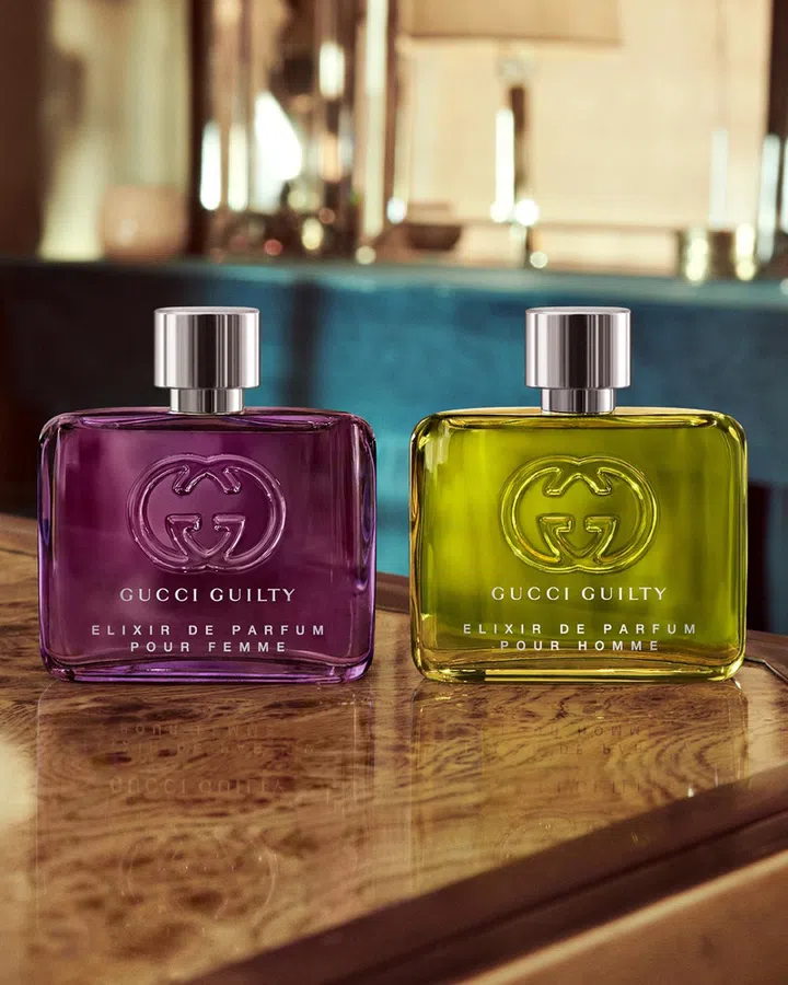 The Gucci Guilty Elixir de Parfum Pour Femme is an ambery floral scent, with wisteria accord and fruity mandora blended with vanilla absolute and tonka beans, while rose and violet accord rounds out the concoction. Its Pour Homme counterpart, on the other hand, is an ambery leather design, with a heavy focus on patchouli. Other key ingredients in here include vanillin extract and orris butters, which help to add warmth, while Ambrofix, nutmeg and benzoin create further depth.