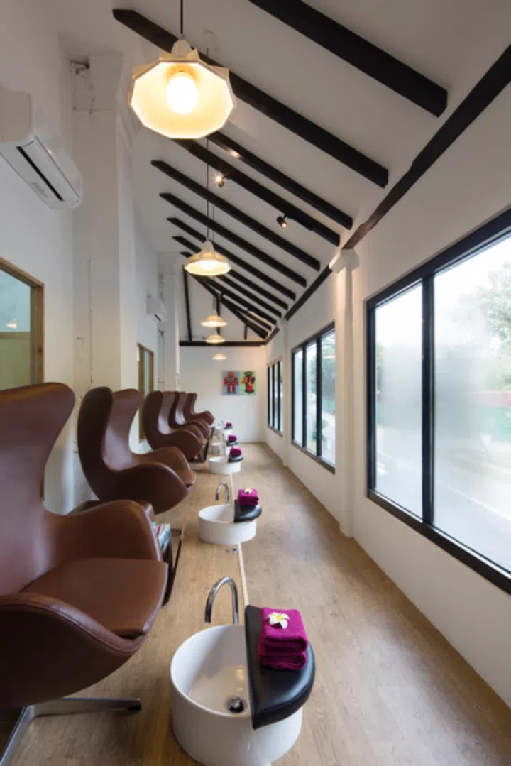 With extravagant furnishings and a sleek colour theme, this luxurious salon is one to visit for a truly pampering experience. Besides its interior, the salon comes equipped with an open kitchen concept comprising different essential oils, massage oils, rose petals, and lemon slices. Customers can then pick and choose the ingredients to be used for their own personalised treatment.