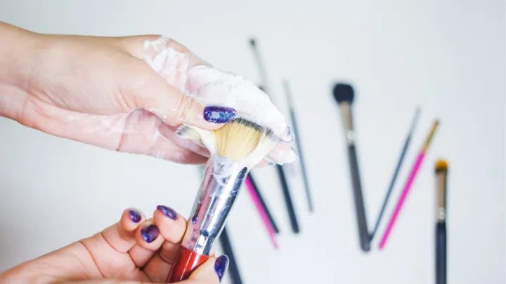 Makeup artist Cheryl Ow has a clever hack: Lather up an old-school soap bar, wet the bristles of your brushes and put the lather through. The soap suds will pull out the gunk and dried powder stuck within the bristles. Rinse under running water till clear.