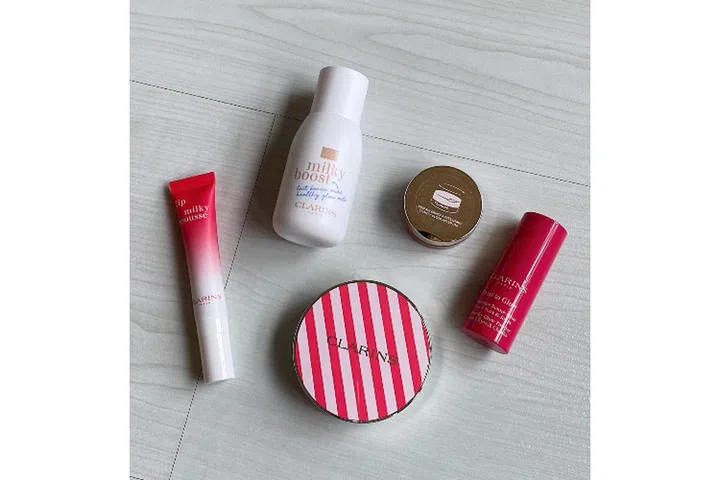 Kim wears Clarins’ Milky Boost foundation that’s said to hydrate for eight hours; Joli Blush in Cheeky Pinky and Twist To Glow powder in Glowy Coral for a light, pretty flush; a hint of Ombre Satin eyeshadow in Purple Rain and Lip Milky Mousse tinted lip care in Milky Strawberry.