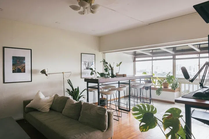 “For my wife and me, it was important that our HDB flat has an abundance of light, a good view, and an interesting site context. Our unit has quite an elongated layout, with a larger number of window panels than the norm. Our unit overlooks low-density conserved buildings so it’s interesting to look out at the street life teeming below but, at the same time, it’s lovely to be able to see the golden light gleaming off skyscrapers in the distance.”