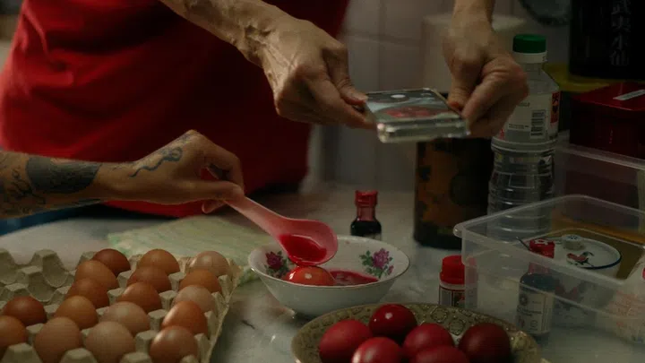 A still from Goh's short film Full Month - here, the lead character's family in the process of dyeing red eggs, which are a big part of the ceremony of celebrating a newborn baby's first month (the catalyst for the return of the lead character to Singapore).