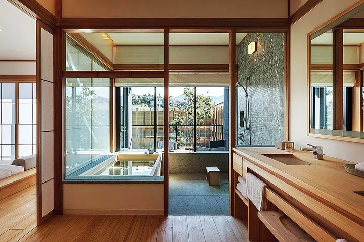 Even if one chooses to simply stay in the ryokan hotel for a few days, it can be equally restorative. The compound is bordered by a modern, reimagined version of the traditional cedar kakine (Japanese fence), of which each guest suite has a private view.