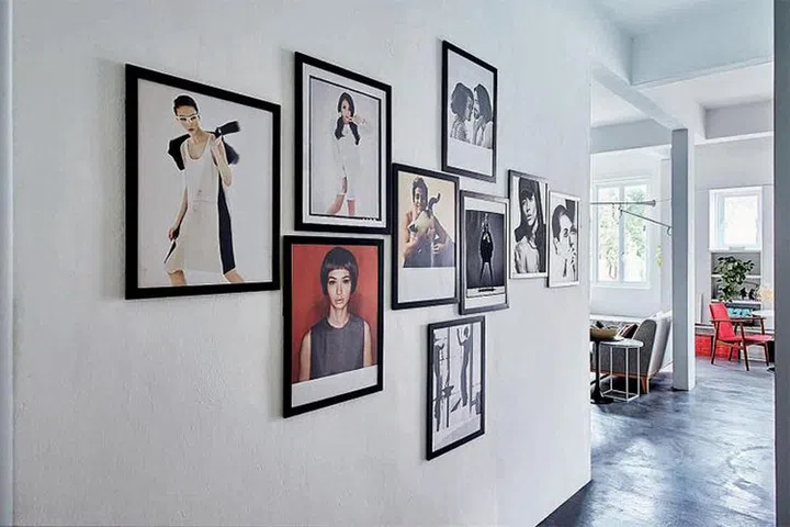 A wall (above), adorned with pictures of the celebrities, artists and models he has worked with, adds an interesting touch to the predominantly white and grey palette.