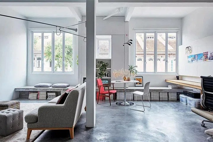 When he saw this second-storey shophouse in Joo Chiat Road with an unusual airwell, he knew it was the one for him. The mid-1970s shophouse was in its original condition, but his decision to look beyond the ageing facade and dilapidated interior paid off. After an overhaul, he now has what he considers the perfect shophouse that is both home and design studio. The original walls of the three bedrooms were removed to create an open plan that makes the 1,200 sq ft shophouse feel like a downtown Manhattan loft. The space freed up from two bedrooms has been transformed into a living room and work area. An existing column could not be removed, but now acts as a divider of sorts, reinforced by furniture.