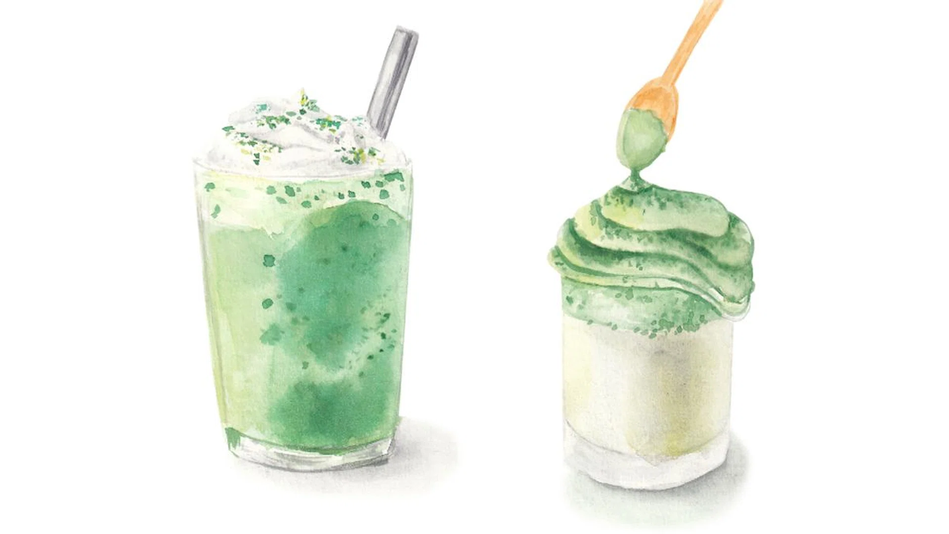Kyo Kohee’s Iced Ichigo Matcha Latte (left) and Iced Okumidori Matcha Latte with oat milk.