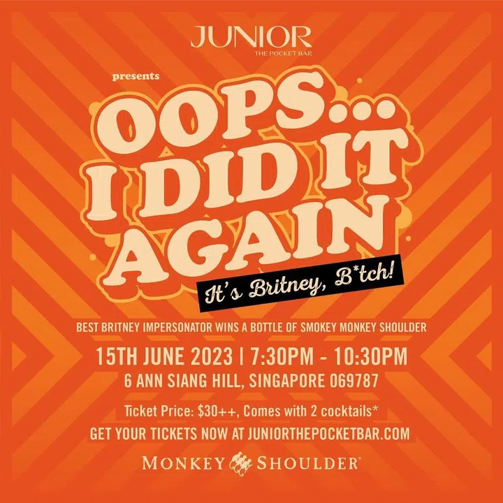 Feeling all kinds of nostalgia? Cocktail bar Junior The Pocket Bar is taking it back to the 2000s with a Britney Spears-themed night. Get ready for a night of glitz, glam, and all the catchy tunes that made Britney a legend as the bar at 6 Ann Siang Hill plays all of her chart-topping hits that you know and love in succession. Come dressed in your best Britney-inspired outfit too – the best dressed wins a bottle of Smokey Monkey Shoulder.