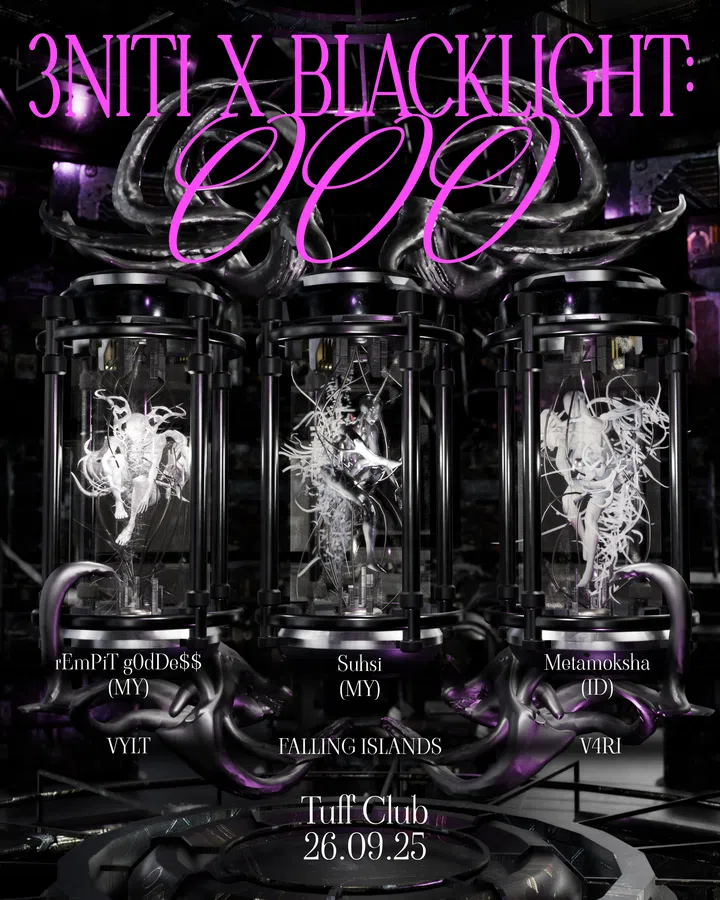 Worlds collide across the causeway as Malaysia’s twisted selectors Suhsi and rEmPiT g0dDe$, who form the collective 3NiTi with Bussy Temple’s own Metamoksha, collaborate with the BlackLight Tribe for a night of unforgiving frequencies. From hard techno and EBM to deconstructed club tuneage that will scramble your brain, it’s all about the venomous fringes of dance music on this rare night.