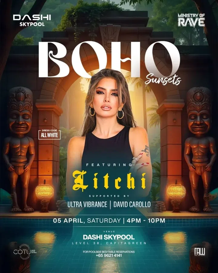 It’s a Bali-esque sunset party right in the heart of Singapore’s CBD. The veterans at Ministry of Rave have launched Boho Sunsets, a new party series set against the glamorous backdrop of Dashi Skypool. This month, Russia’s DJ Litchi takes the reins with her crowd-pleasing blend of melodic techno, infused with shades of afro-tech and progressive house to keep the spiritual vibes flowing.