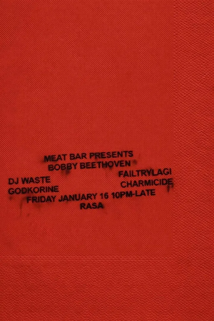 His old name (Total Freedom) suggested welcomed chaos, while his new name suggests royal musical lineage. Nonetheless, the DJ and producer was raised on punk and made his name in the legendary footwork-scuffed Fade to Mind crew. So anything goes with Bobby Beethoven, the first talent ushered in by new party collective Meat Bar, flanked by a motley crew of fearless selectors in Godkorine, DJ Waste, Failtrylagi and Charmicide.