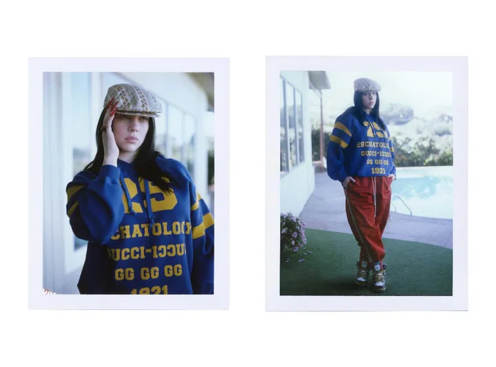 Billie Eilish appears in the fifth episode of Gucci's Ouverture of Something that Never Ended in a men's look that consisted of a flat cap with a flower design, a printed collegiate sweater and red trousers.