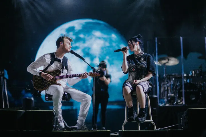 Eilish performed alongside her brother Finneas at the When We All Fall Asleep Tour in a space bun, loose-fitting graphic tee, shorts and boots.