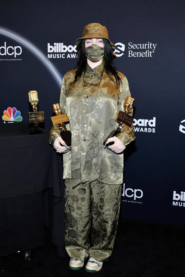 Eilish took home three awards at the 2020 Billboard Music Awards, including that of Top Female Artist, wearing a full custom Gucci ensemble. The look included an olive green ottoman floral jacquard oversized shirt and pants set with a self-tie scarf, blush lace gloves, a matching bucket hat and white and leather sneakers adorned with web and crystal detail.