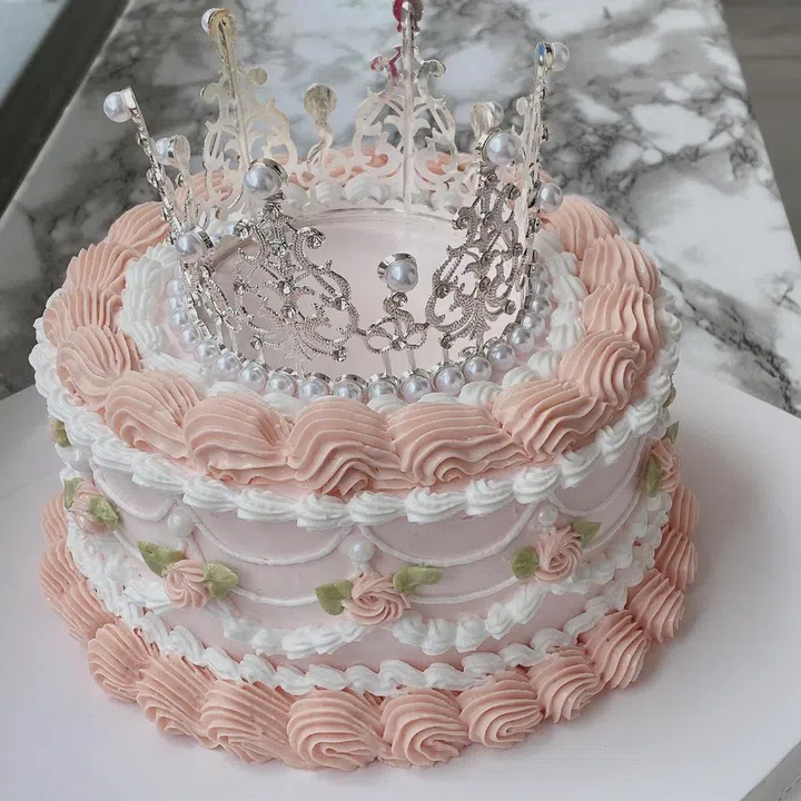 Kitschy, gaudy, and ornate, we’re talking layers of buttercream frosting, pastel colours, ribboning motifs, cursive text and details like pearls, glazed cherries or even tiara toppers.