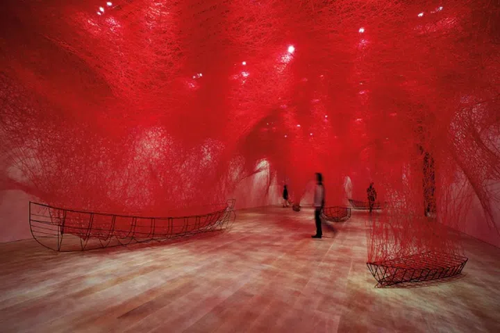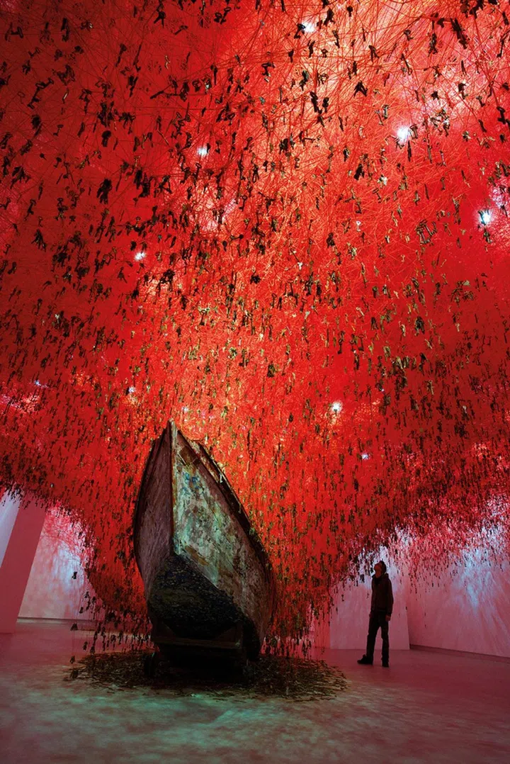 In 2015, Chiharu was invited to take over the Japanese Pavilion at the Venice Biennale, where she stretched compact, crisscrossing geometries of red thread throughout the space in which rusty keys floated above old rowboats, speaking of memory, displacement and moving from one culture to another, in her installation, The Key In The Hand.