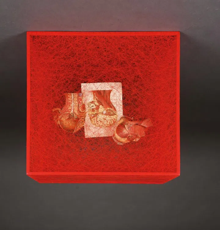 In Out of My Body, an installation expressing her connection with her body, Chiharu’s feet stand beneath net-like suspensions of red leather, creating a whirlwind of energy where her body once was. Her intriguing cubes containing clothing, a skull and anatomy books dangle amidst layers of knotted string, while a maze of threads appears to dress the canvases in “skin”.