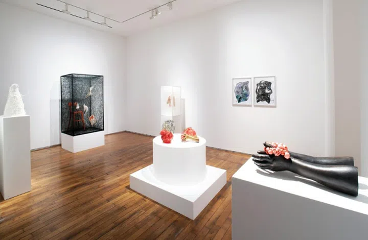 The clear and red glasses sculptures in the installation Cell resemble organs or cells entangled in wire-rubbed shoulders with outstretched bronze arms and hands cast from her arms and hands and those of her husband and daughter “to immortalise our connection”.