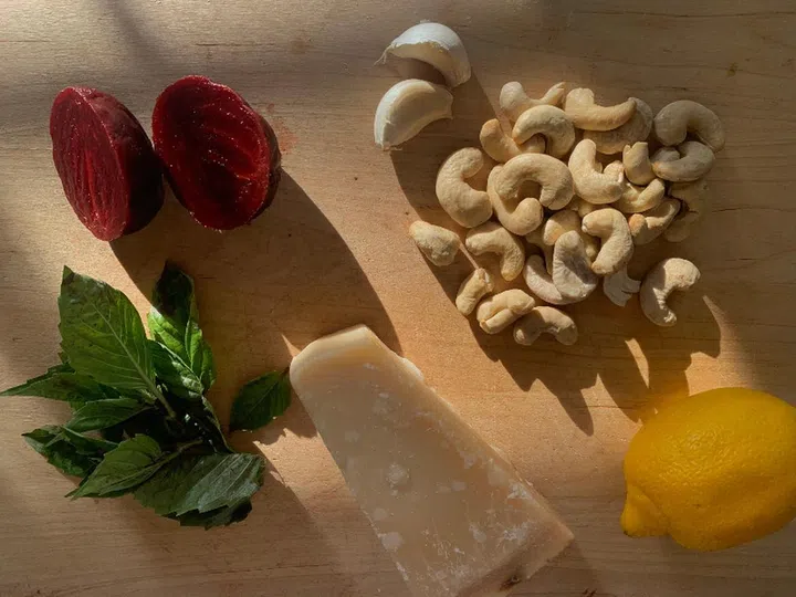 "This is a beet pesto with whole wheat spaghetti which I paired with some sauteed ramps. It’s essentially a basic pesto recipe – pine nuts (I used cashew though), basil, parmesan, garlic, lemon juice, salt, and pepper – with an addition of roasted beets, Aleppo pepper and a dash or two of pasta water. I saw a recipe online one day but winged it on the spot based on memory and taste. That's usually how I do things nowadays."