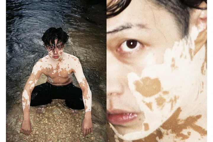 I shot this photo at a nature spot my friends and I usually go to and it was completely unplanned. We just started messing around with the wet clay on the rocks and spread it all over our bodies and when it started drying it created random patterns from the irregular drying, which was when I saw a good opportunity to capture some pictures on film."