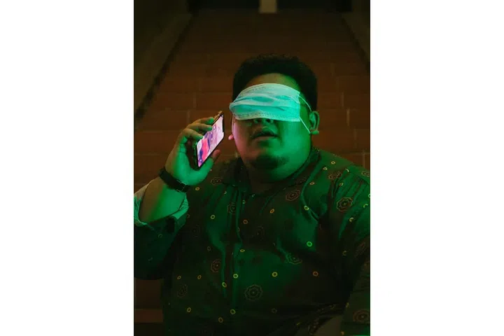 At this point in time, I happened to remember a COVID-19 meme post from reddit. The meme was inspired by the three mystical apes (see no evil, hear no evil and speak no evil) which was poking fun at people who use their face mask as an eye mask. After his phone call, I told Shai to use his mask on his eyes and give a shocked expression like he’s seeing something incredible, which was ironic since he can’t see anything. The reason green was used as a light source was to do something opposite of what Jasmine told us to do. Basically, it was to avoid using the color green as there is a possibility of having a printing issue. The photo turned out amazing and Jasmine decided that we should put the picture on the zine. There wasn’t any printing issue."