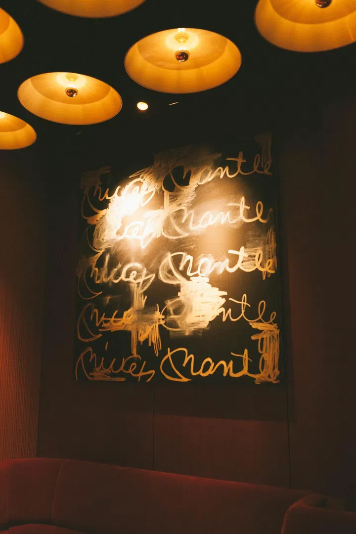 The space is theatrically lit to create a cosy, dramatic atmosphere, down to the theatre booth downlights which illuminate each step through Corduroy Palace. As guests head down the hall of wine, the 10 cooler doors are lit as a nod to installations by mid-century artist Dan Flavin.