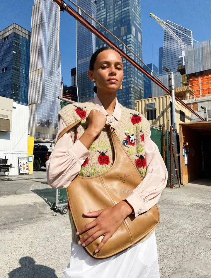 On Aarika: Embroidered wool sweater, leather pants and Rogue leather bag. On Nithiya: Classic Cashin cotton and leather coat, and Cashin leather tote with embroidery. On Mae: Ergo leather shoulder bag, wool sweater vest, cotton shirt and skirt and her own earrings. All Coach throughout unless otherwise stated