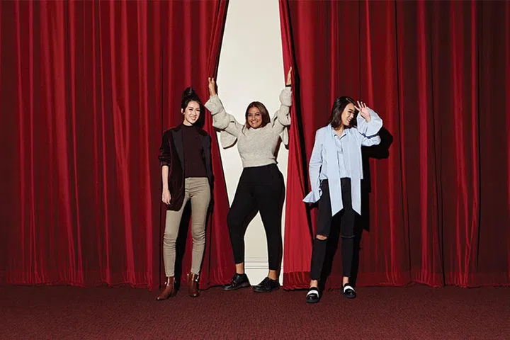 On Tan: Blazer, Dunhill. Sweater, H&M. Pants, her own. On Nair: Iris & Ink sweater, www.outnet.com. Pants, her own. On Lee: Iris & Ink shirt, www.outnet.com. Jeans, her own.