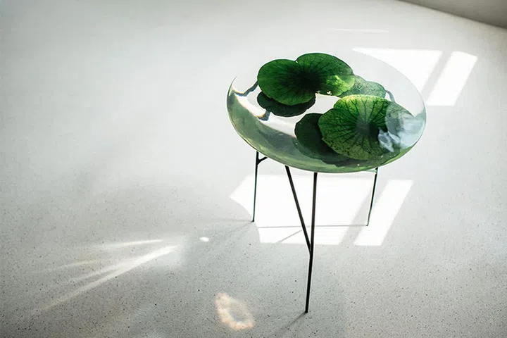 loat (2014), cast resin, lotus leaves, powder-coated steel