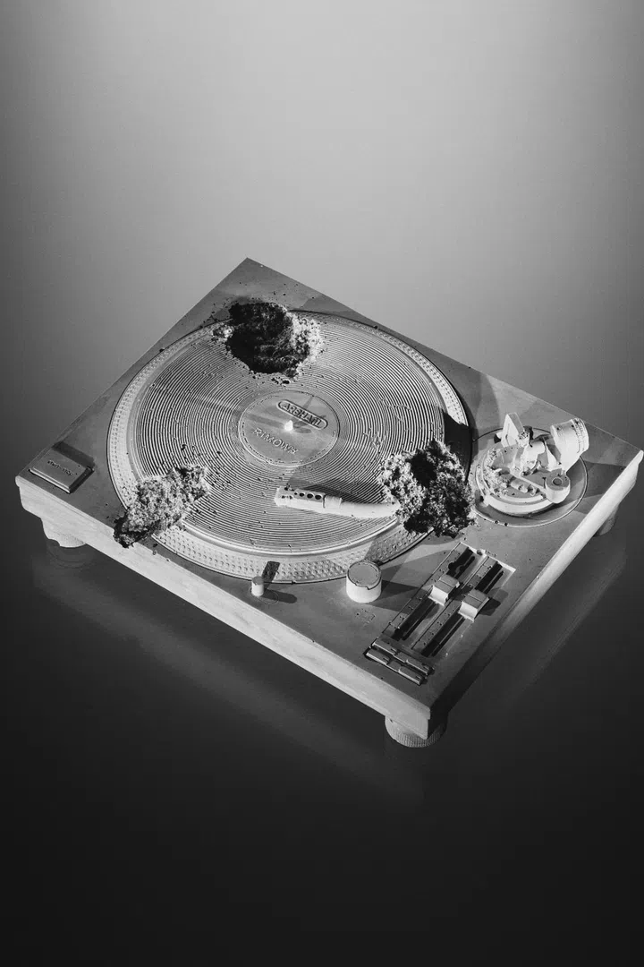 Encapsulated within is an eroded hand-cast turntable made from plaster and crushed glass to evoke a rare archaeological find. Arsham describes the turntable and Pilot Case as pieces from a "future dystopia". Reminiscent of his famed Future Relic series that put a futuristic play on mundane objects, the turntable also reflects his interest in documentation and architecture.
