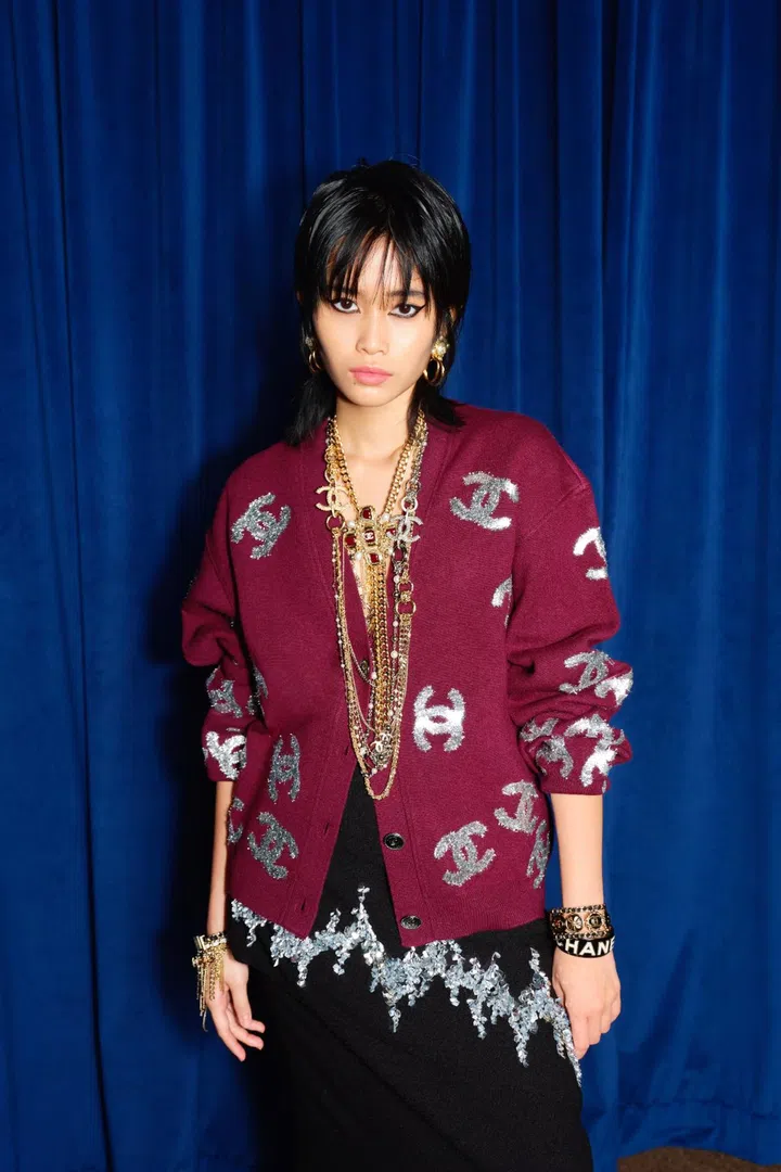 Dewy wears a cashmere cardigan with glitter; wool tweed skirt with silk; metal and strass earrings; metal lavalier necklace with imitation pearls, glass and strass; metal multi-chain necklace with glass pearls and diamantes; metal multi-chain necklace with natural stones, glass pearls and strass; (right hand, top) metal, lambskin and calfskin cuff; (right hand, bottom) metal chain bracelet with natural stones, glass pearls and strass; (left hand, top) metal, lambskin and calfskin cuff; and (left hand, bottom) metal and resin bracelet. All Chanel