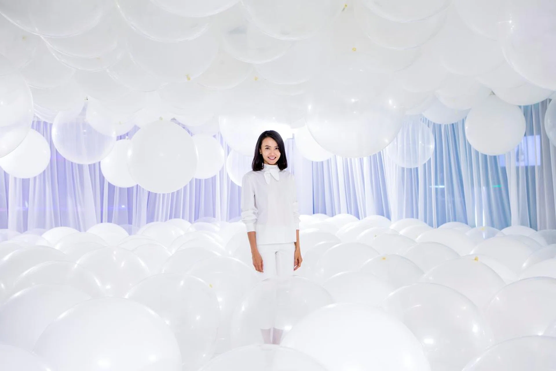 For Harmony (Dom Pérignon Vintage 2005) Ng displays her craft through an installation entitled White. A round white tent lit from within, the installation creates an air of mystery as viewers are confronted by large circular shadows floating behind a gossamer veil flowing from ceiling to floor. Upon entering, viewers are surrounded by large translucent inflated orbs suspended at different heights. Creating a sensation of total immersion, viewers move through the sea of orbs, which allude to Harmony. The installation draws inspiration from the Dom Pérignon Vintage 2005, which is a harmonious assemblage of the finest black and white grapes.