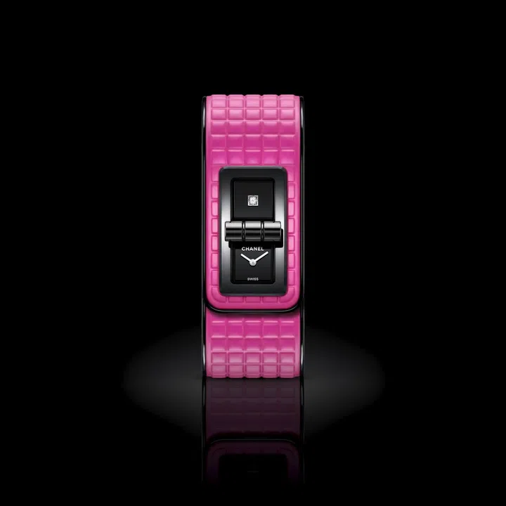 The Code Coco – Chanel’s distinctively cool answer to a jewellery watch with its cuff-like strap and innovative clasp inspired by that on the 2.55 handbag – gets a bold, youthful makeover with a matte fluorescent pink leather band with a black trim.