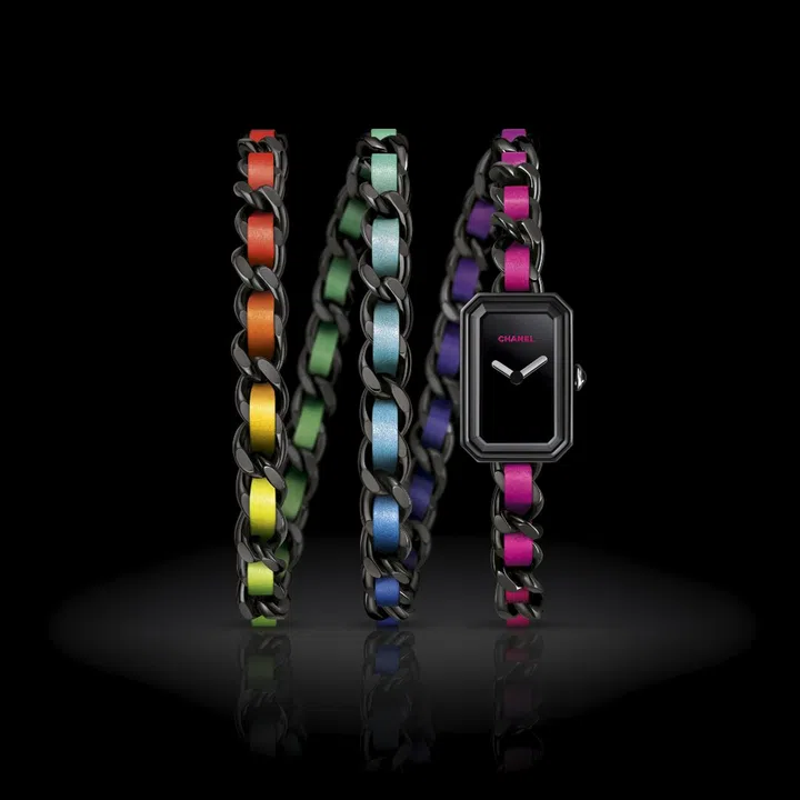 Chastaingt’s unexpectedly fun update of Chanel’s feminine, Place Vendome-inspired Premiere watch sees him take the Chaine Triple Tour – or triple-looped strap – version; coat its case and chain bracelet in ADLC (amorphous diamond-like carbon) for a metallic black finish; then contrast it all with a neon rainbow leather strap woven through.