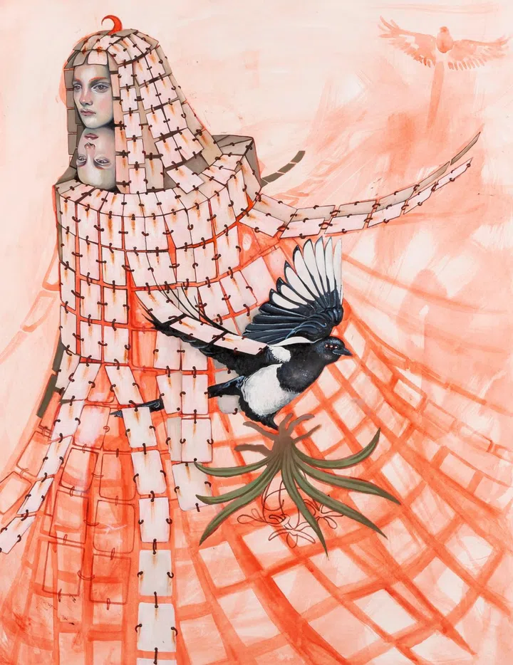 "I like to think of myself as an inspiration magpie. Anything that visually stimulates me somehow appears in my work. I gradually piece together the things and images I collect subconsciously before they materialise in my artwork. My main motifs include birds, tudor ruffs, orchids, long necks and recurrent forms. Listing them out here has made me realise there really isn't anything that ties them together. I don’t have a complex reason as to why I include these motifs; I simply find them beautiful, and I have an urge to paint beautiful things in the weirdest fashion.