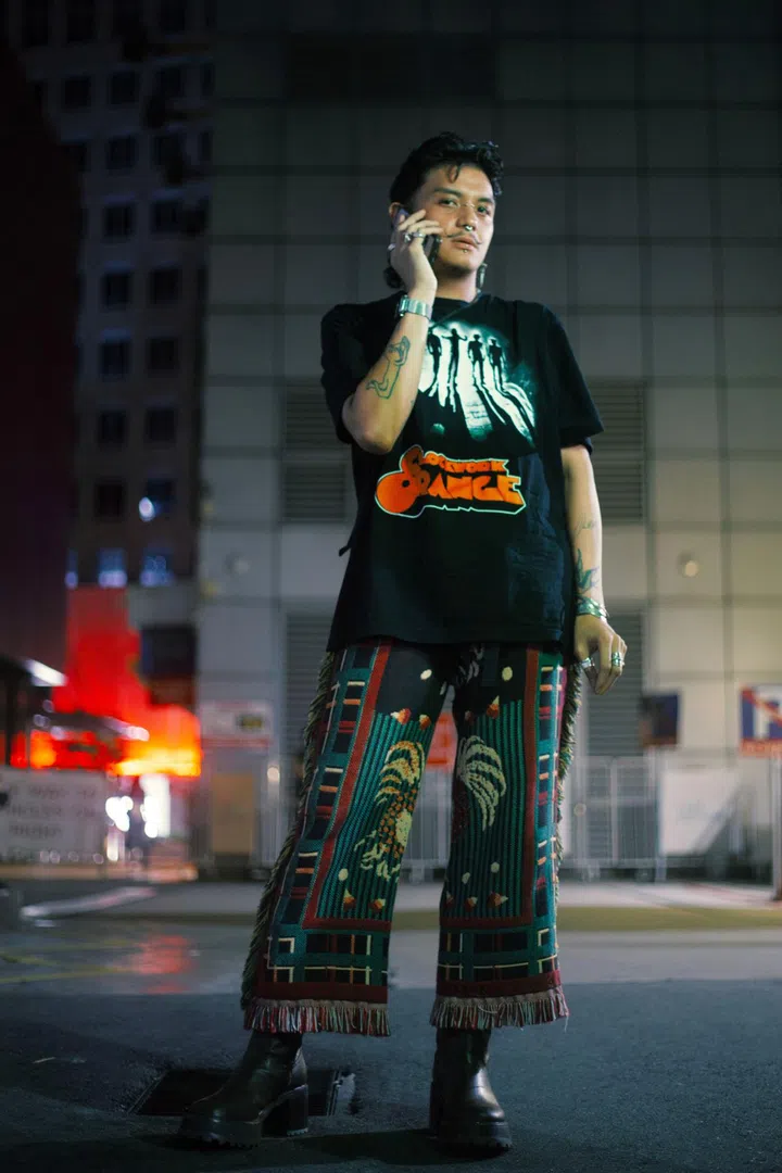 There are many references to past looks and eras, but we can't quite put my finger on it. How would you explain the influences on today's style? "I don't adhere to any specific era; I always enjoy challenging myself to present a timeless style, blending elements of the past with a futuristic twist that still retains its historical essence. While I don't feel connected to the current popularity of Adidas Sambas, I did wear fake Adidas Sambas when I was 15 years old, interpreting sportswear as attire for hunting or clubbing as a primitive ritual, influenced by the 'abang-abang' (elder male relative or friend) style."