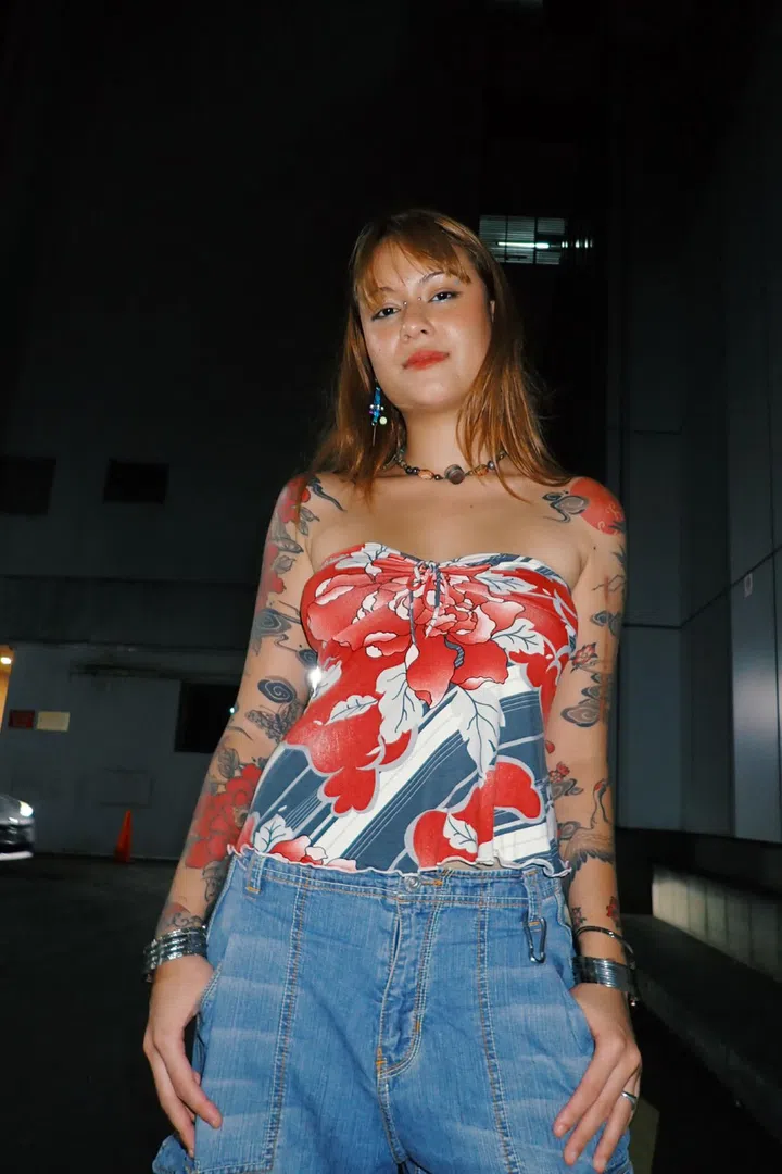 What's the thought process behind your look? "I tune in to what kind of touch my body craves that day – either a lot of fabric hugging me or as little as possible. Then, I choose the colour I feel like wearing. My favourite combination is blue and orange, but I also love reds, pinks, and purples. I'm a fan of accessories, especially dangly earrings and handmade necklaces – anything flashy. I adore flowers and have many shirts and dresses with floral patterns. Although I'm a bit scared of piercings, I bought fake piercing stickers to experiment with my looks – I love tricking people with them."