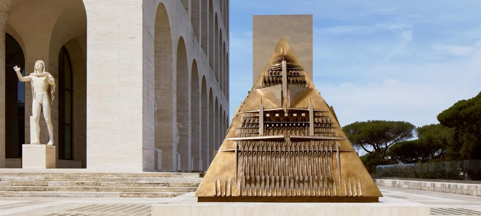 From large-scale arches and luxurious sculptures to buildings constructed for spectacles and the Latin word, the Romans pioneered many feats of engineering, design, the performance arts and language. Fendi’s latest effort to use art to spotlight Italian heritage and culture thus could not be more fitting. Hosted at the brand’s headquarters in Rome till Oct 1, “Arnaldo Pomodoro. Il Grande Teatro delle Civilta” – or “Arnaldo Pomodoro. The Great Theatre of Civilizations” – is a recently opened public exhibition showcasing about 30 works of its namesake artist: a Montefeltro-born, Milan-based nonagenarian sculptor whose expansive repertoire fuses all four aforementioned disciplines, and whose creations look like they hail from another space and time. We head to the Eternal City for an exclusive visit and offer a peek into the world of this architect of dreams.