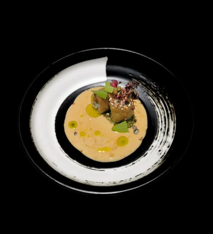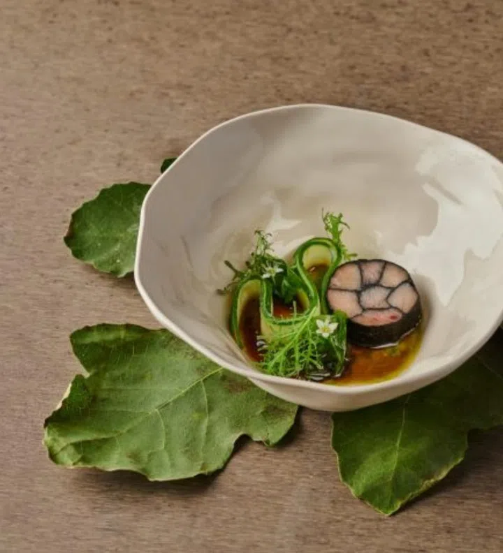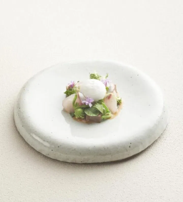 Inspired by a farmer’s breakfast of bread, pears and raw artichokes dipped in olive oil, executive chef Daniele Sperindio’s Colazione nei Campi is a delicate, multilayered dish of sweet and savoury. Charcoal-roasted and flavoured with house-made vegetable-based ‘fish sauce’, thin slices of the fruit overlap atop a small mound of baby artichokes, viola artichoke custard, comice pear sorbet, whipped artichoke and aged sand carrot.