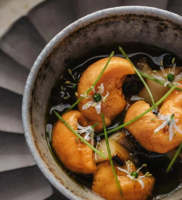 Sister restaurant of Frantzen helmed by executive chef Tristin Farmer, Zen recently won its third Michelin star for its Nordic approach to locality and seasonality. For autumn, the Chawanmushi with slow-growing tokobushi (abalone) and Bafun uni ensui (sea urchin packed in saltwater) in cauliflower dashi is Farmer’s ode to the season’s best produce. The tokobushi is steamed in ginger dashi then grilled with horseradish dipping sauce, while its liver is also used, grilled then marinated for 24 hours in white soy, mirin and sake. Chives or he-mengi and its flowers, sweeter during the fall, are also used as garnish.