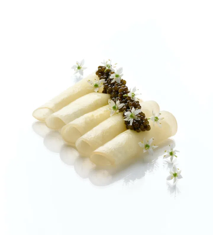 British autumn takes the form of pears and figs in desserts at the two Michelin-starred restaurant but it’s the simple white beetroot that’s given its turn in the spotlight. Cut into paper-thin sheets, it’s salt baked then rolled into a cylindrical shape. Like a cannoli, it’s stuffed with a soft cheese with a hint of horseradish then topped with Kristal caviar, edible flowers and finished with a dill cream sauce.